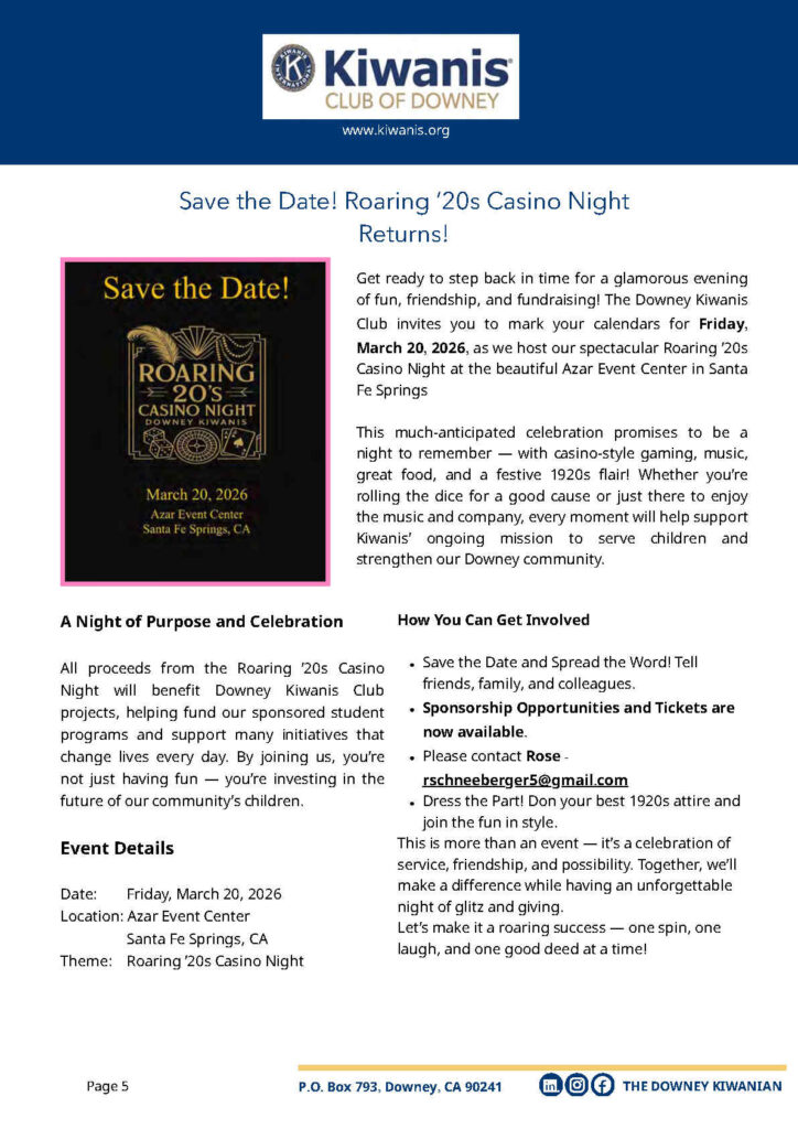 The Downey Kiwanis Club is dedicated to serving the local community through various service and fundraising projects. Our club has been in service to our community for 99 years. We are part of Kiwanis International, an organization serving children in local communities throughout the world for over 100 years.